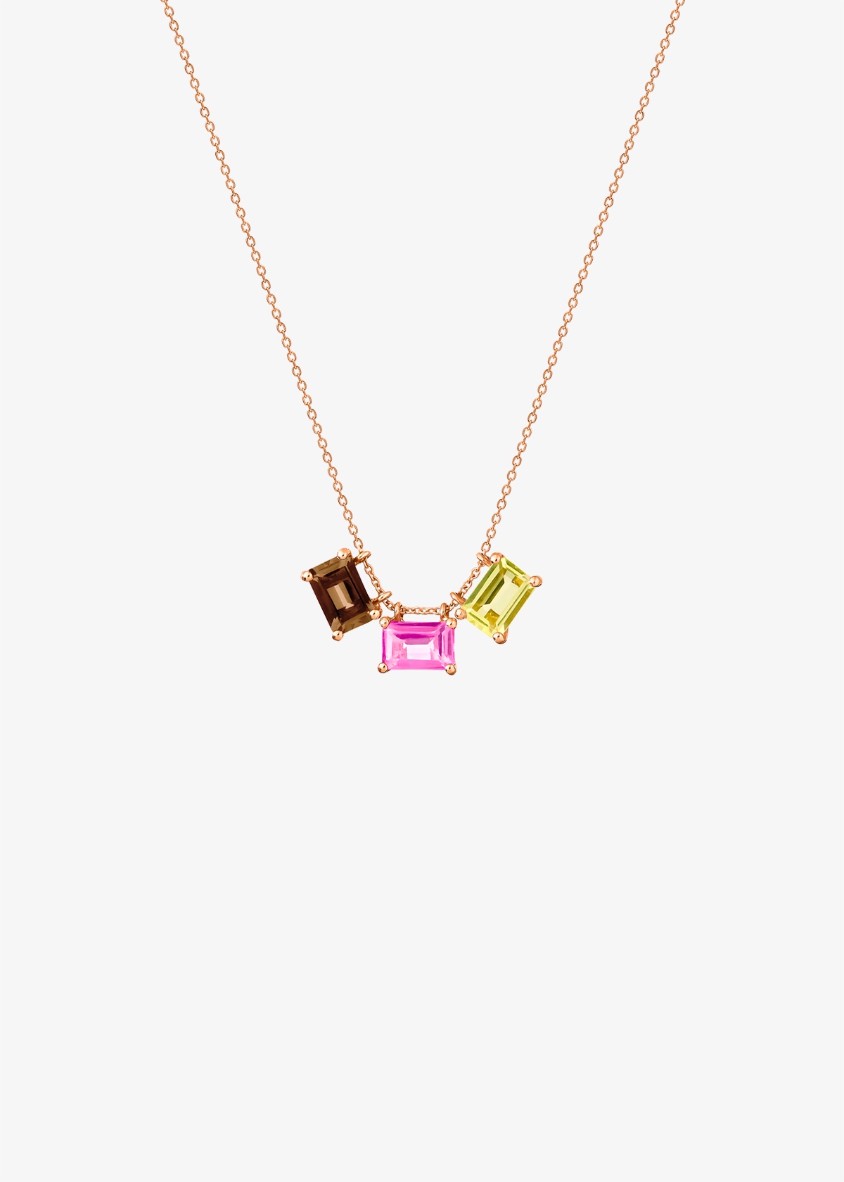 18 karat rose gold necklace smoky quartz, pink topaz and lemon quartz (1,83 ct), 17" motifs size : 0,23"X0,16"